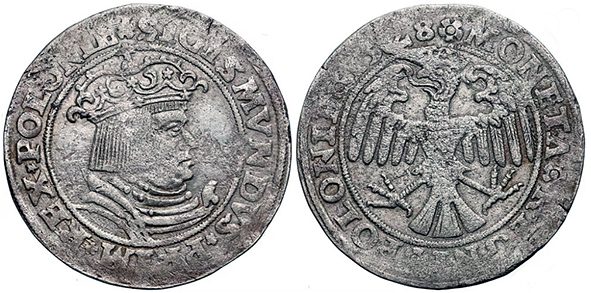 Перший польський «трояк коронний» (шаг) 1528 року.